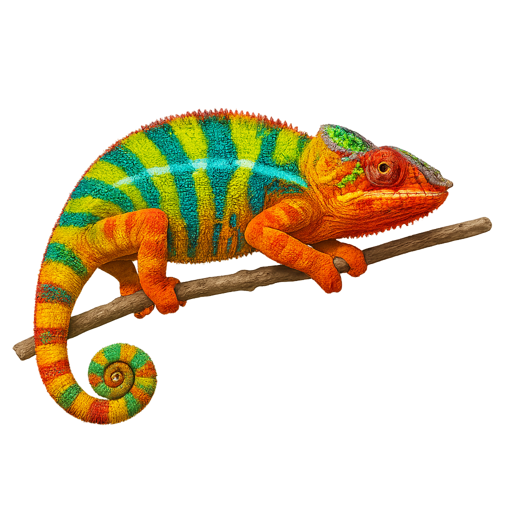The Panther Chameleon is an iconic species from Madagascar, famous for its vibrant colors and impressive patterns that vary depending on its mood and environment. This chameleon is primarily arboreal, living in the humid tropical forests of the island, where it hides among branches and foliage. It is also known for its ability to change color, an adaptation that helps it camouflage but is also used during fights between males or to attract a female. Although generally calm, it can become more active during the breeding season.