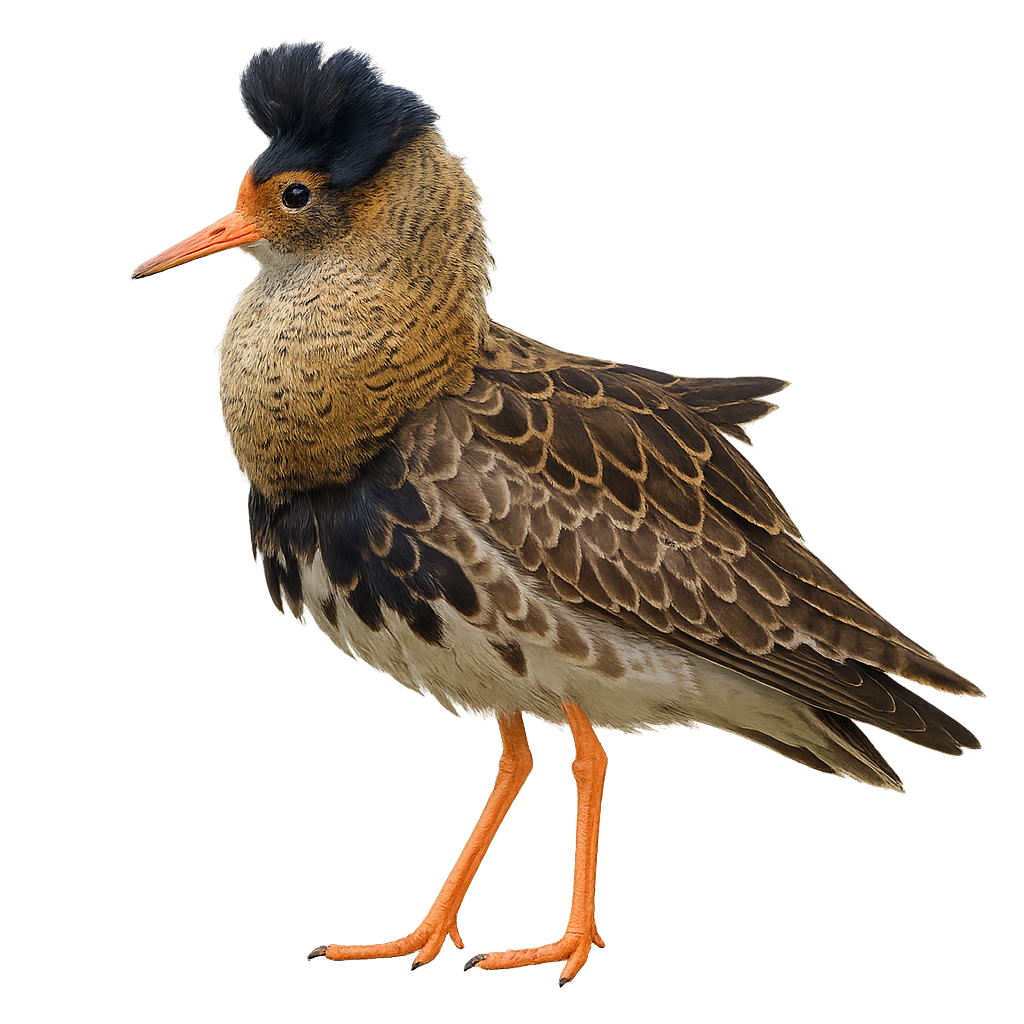 The Ruff is a medium-sized wader bird, easily recognizable by its colorful plumage and relatively large size for a bird in its family. The male is particularly distinctive during the breeding season, with vibrant plumage ranging from brown and white to red and orange, and a large ruff that surrounds its head. Outside the breeding season, the male loses its bright colors and presents a more subdued plumage similar to the female.